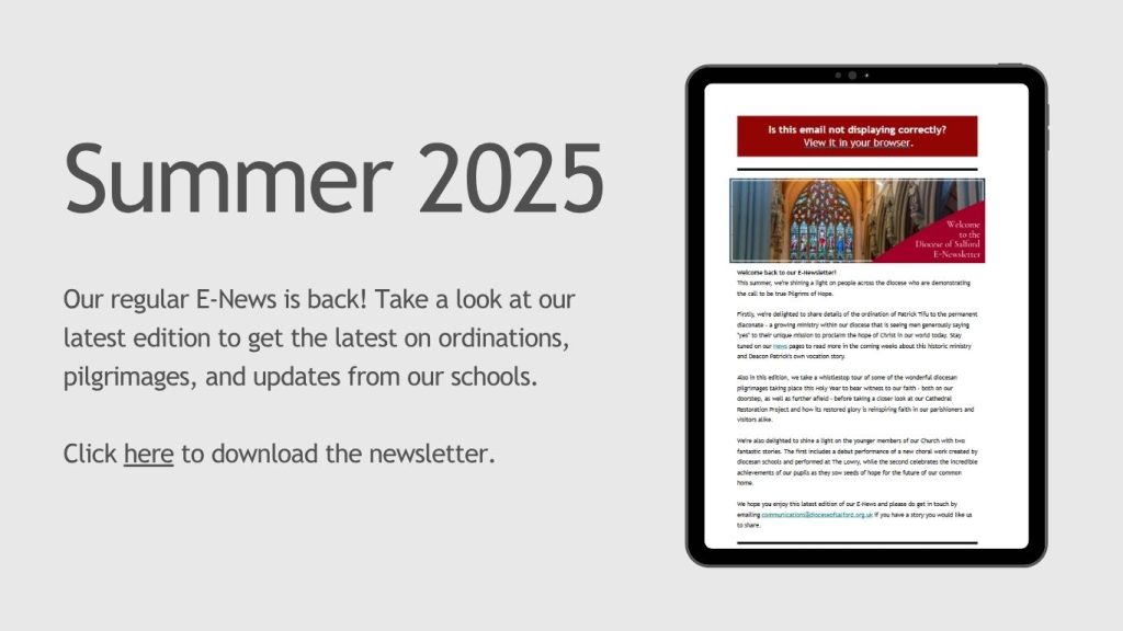 If you would like any more information about the E- Newsletter or would like to unsubscribe please email communications@dioceseofsalford.org.uk
