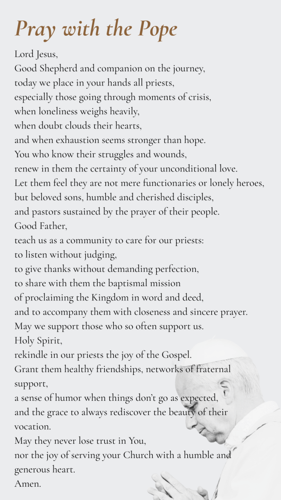 To end his homily, the Bishop called attention to the prayer shared by Pope Leo for the month of April, which encourages us all to pray for those priests who are facing any type of difficulty in their vocation. Whether this be through personal illness, a sense of isolation or loneliness, or facing difficulty in building the community in which they serve, Bishop John encouraged us to pray for these priests, and for all priests within our diocese as they renew their commitment to ministry.
